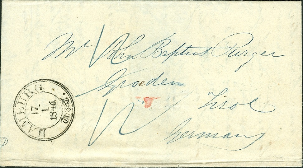 Dann wurde der Brief am 17. Januar 1846 der Post übergeben. Die Aufgabe dokumentiert durch diesen taxischen Hamburg-Stempel, einem K3.