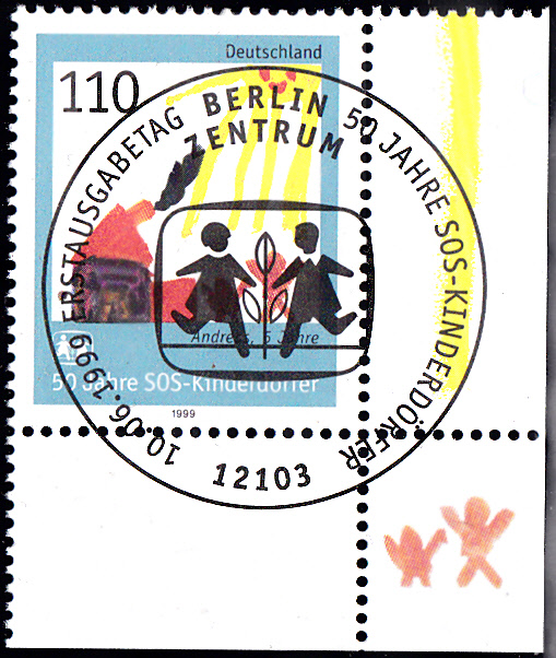 Auf der Marke der Deutschen Post (MiNr 2062) zum Jubiläum "50 Jahre SOS-Kinderdörfer" zeigt die Kinderzeichnung "Mutter und Kind vorm Haus" von einem Andreas (5 Jahre).