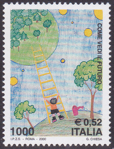 Zum Internationalen Malwettbewerb für Kinder "Zukunft auf Briefmarken" wurde in Italien eine Briefmarke (MiNr 2710) verausgabt. Sie zeigt eine Kinderzeichnung auf der ein Kind eine Leiter an einen fremden Planeten lehnt.