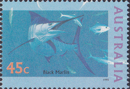 Auf dieser Marke aus Australien (MiNr 1508) ist eine Dickkopf-Stachelmakrele (Caranx ignobilis) abgebildet. Bei Michel wird sie Große Pferdemakrele (Caranx ignobilis) genannt.