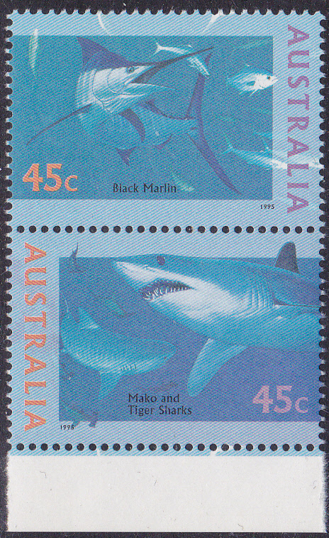 Auf dieser Marke aus Australien (MiNr 1508) ist eine Dickkopf-Stachelmakrele (Caranx ignobilis) abgebildet. Bei Michel wird sie Große Pferdemakrele (Caranx ignobilis) genannt.