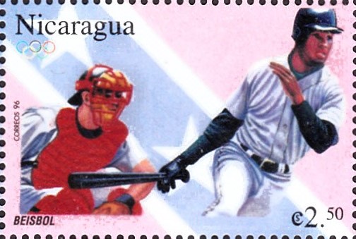 Aus Nicaragua kommt diese Marke (MiNr 3769) mit zwei Spieler beim Baseball.