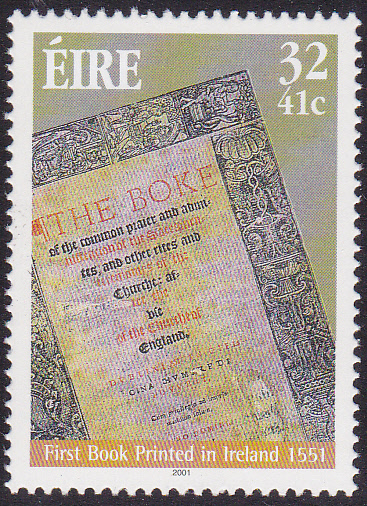 Zum Jubiläum "450 Jahre Buchdruck in Irland" ist in Irland diese Marke (MiNr 1322). Die Marke zeigt den Titel des ersten gedruckten irischen Buches "The Boke of the Common Prayer".