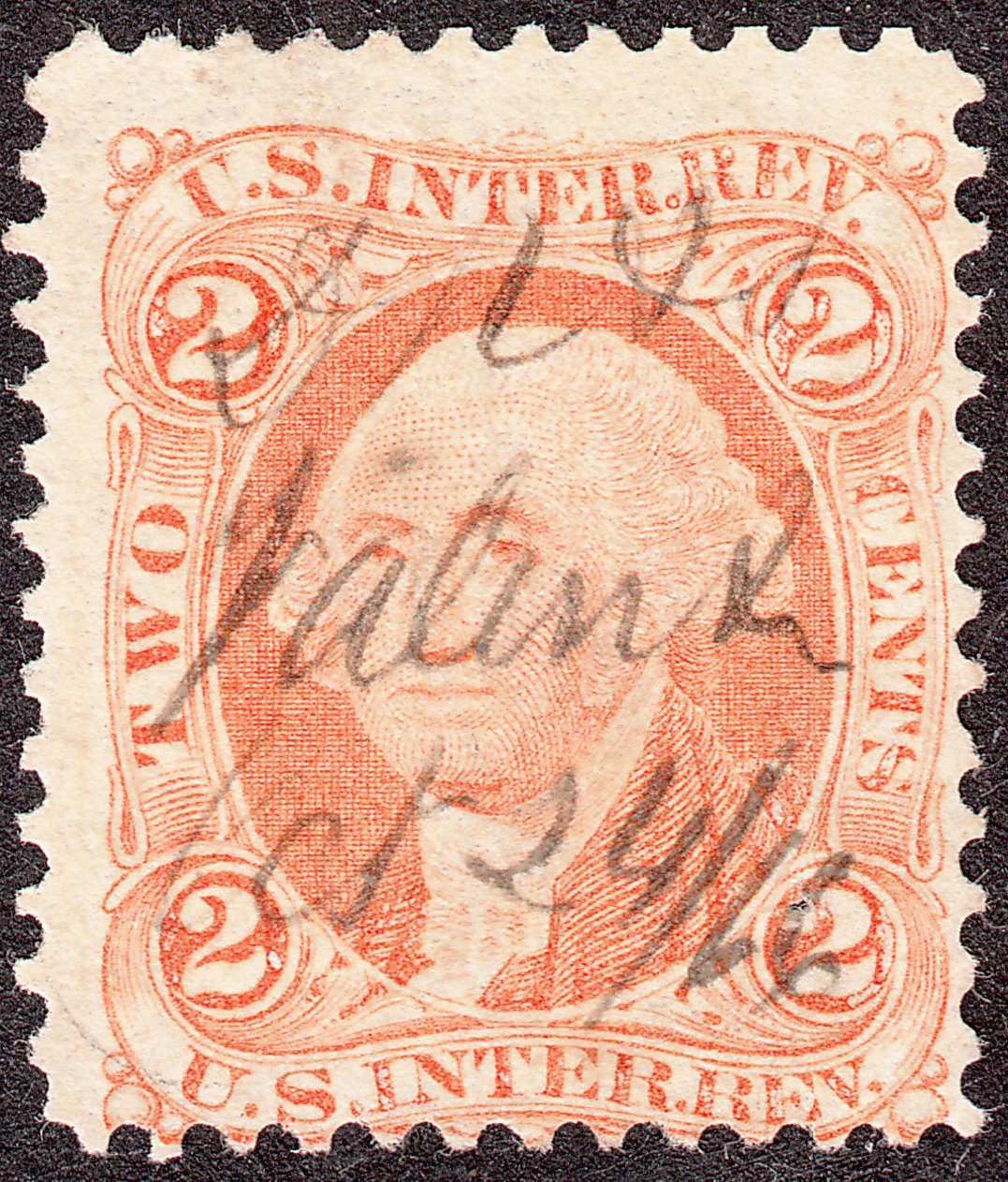 Die Wertstufe 2 Cents in orange mit der Inschrift "U.S.INTERN.REV." ist bei Scott unter "R13" katalogisiert, die gezähnte Version somit als "c", hier mit Federzugentwertung: