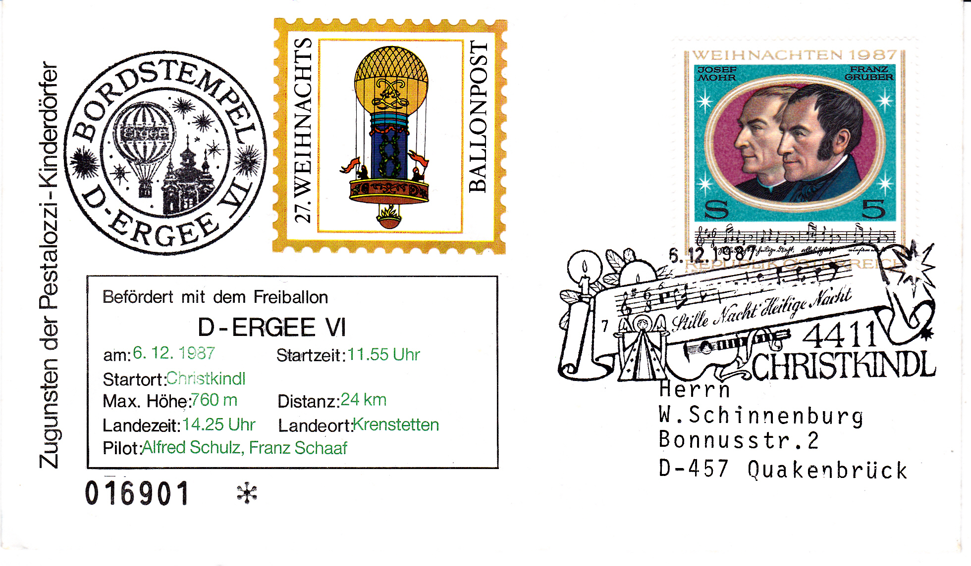Hier wurde der Sonderstempel Christkindl 1987 mit der Kennziffer "3" am 6.12.1987 auf einem Beleg zur 27. Weihnachtsballonpost der Pestalozzi-Kinderdörfer abgeschlagen.