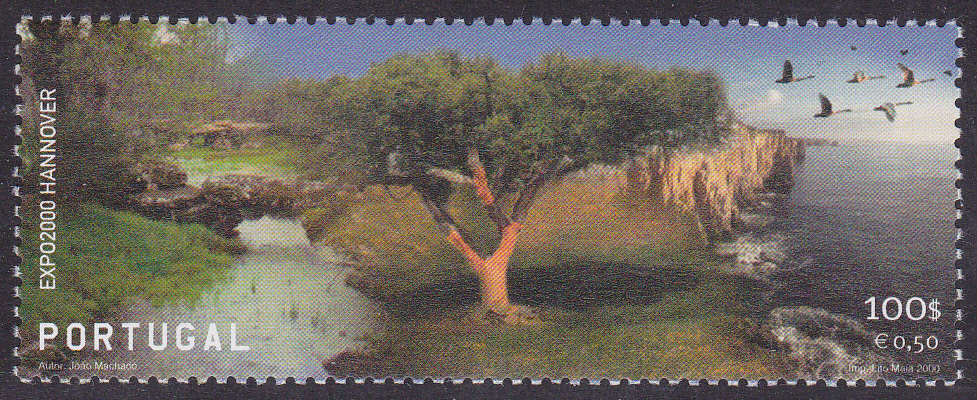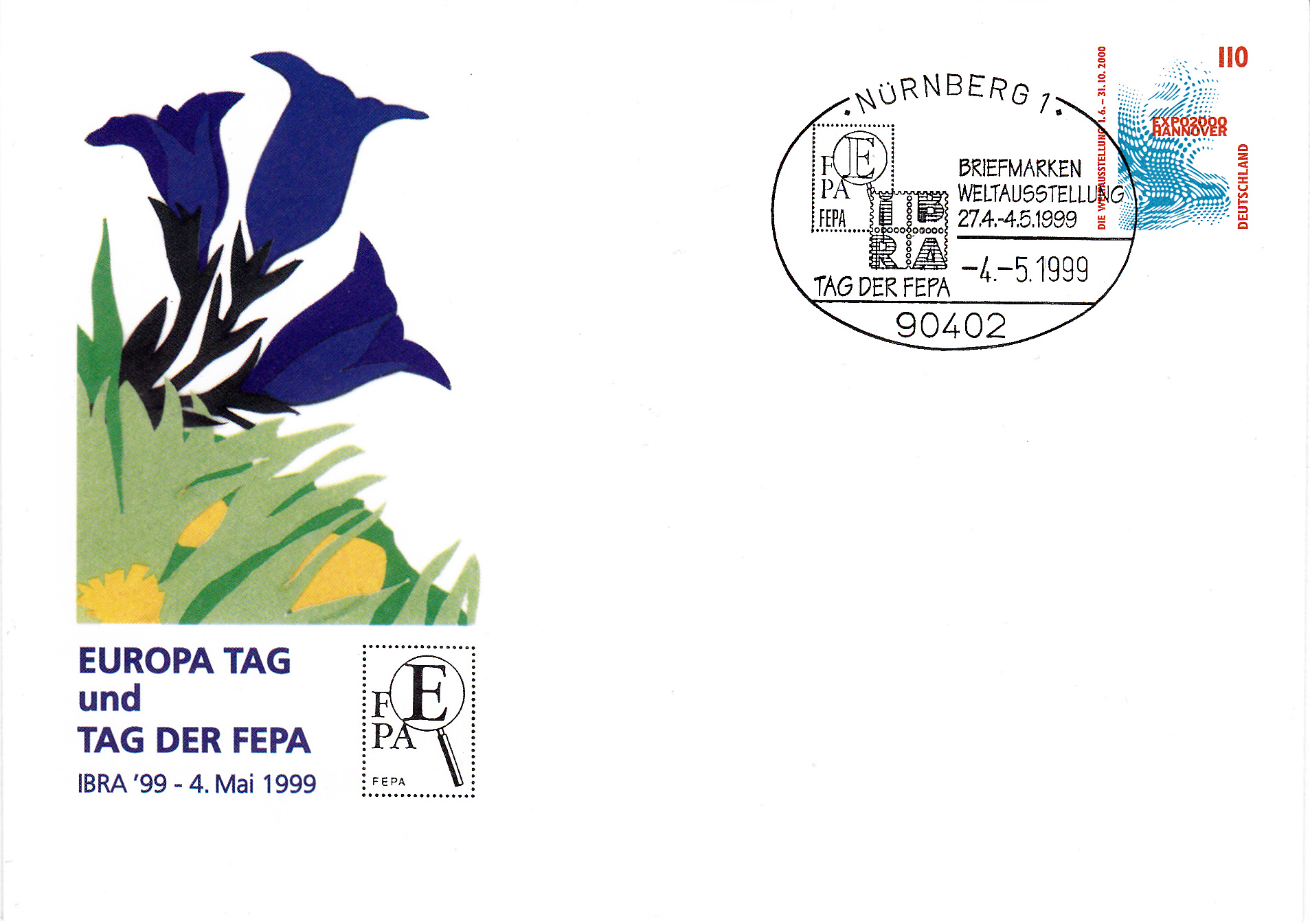 Marke zu 110+50Pf Motiv Chinesische Kalligraphie (MiNr 2121) aus der Serie "Für die Jugend" 2000, die Motive zum Thema "EXPO 2000 Treffpunkt der Jugend der Welt" zeigten, auf einem Brief mit Sonderstempel aus Laatzen vom 8.6.2000, dem Ersttag der Marke. Im Stempel wird die EXPONALE, eine Fußgängerbrücke auf dem Gelände des ehemaligen Expo-Geländes im Stadtteil Mittelfeld abgebildet.