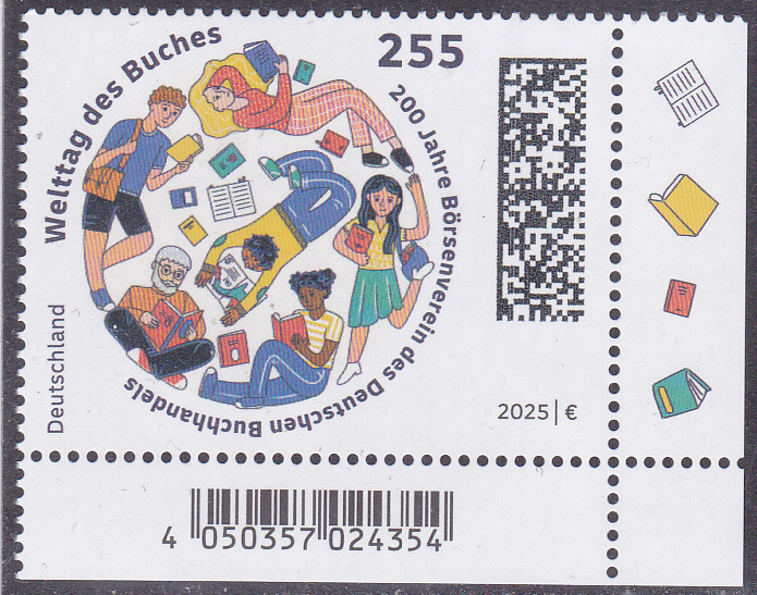 Bei der Deutschen Post erschien 2025 zum "Welttag des Buches" und zum Jubiläum "200 Jahre Börsenverein des Deutschen Buchhandels" diese Marke (MiNr 3902) mit Menschen beim Lesen von Büchern.
