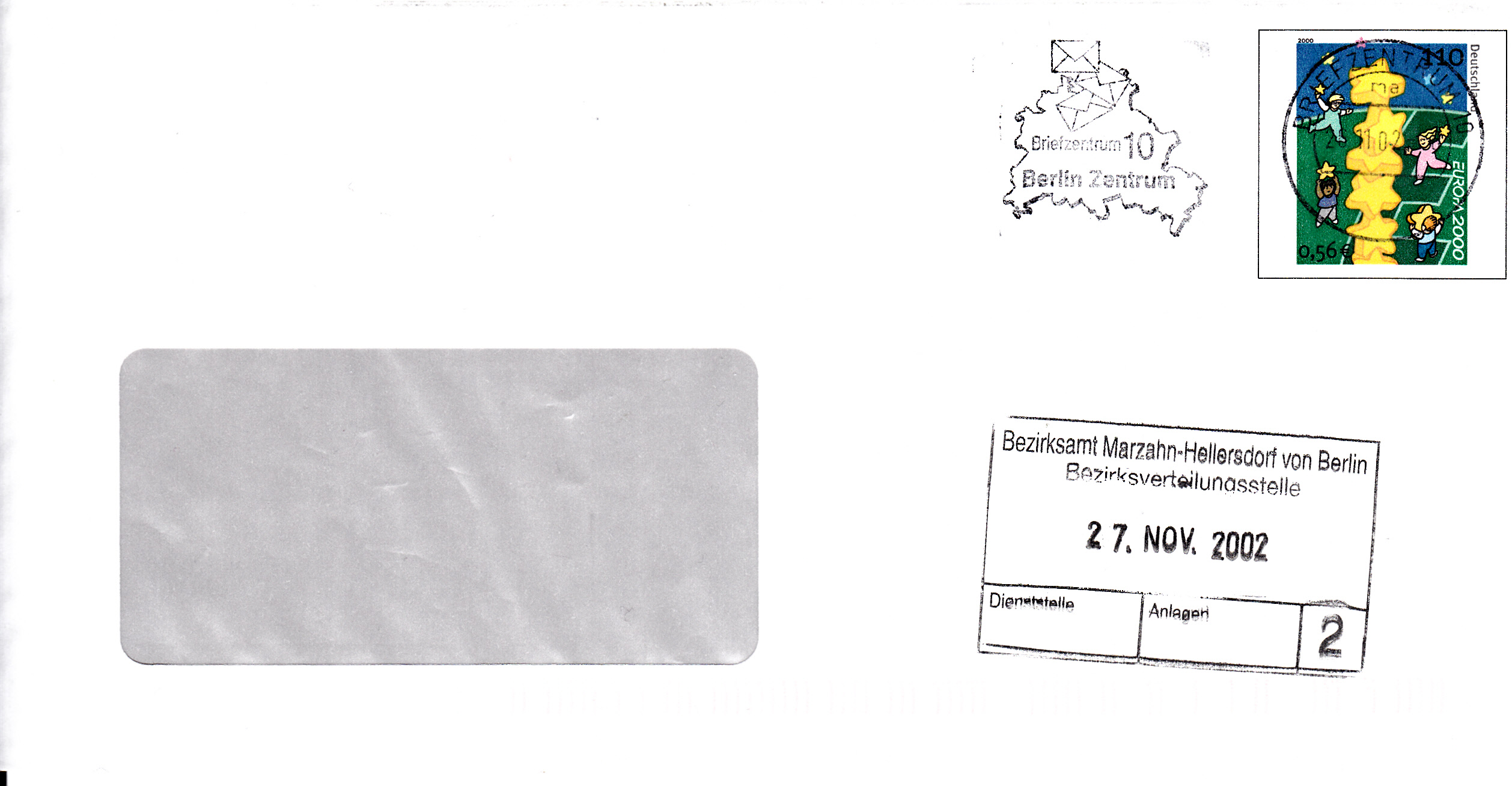 Der hier gezeigte Plusbrief mit dem Wertstempel der Europamarke 2000 unterscheidet sich äußerlich nicht von dem im vorigen Beitrag. Er unterscheidet sich aber, wenn man in den Umschlag schaut: beim grauen Innendruck ist um das Fenster herum eine schmale Aussparung zu sehen (weiß also ohne Druckfarbe grau). Dieser Umschlag hat die Katalognummer USo 21BIb).