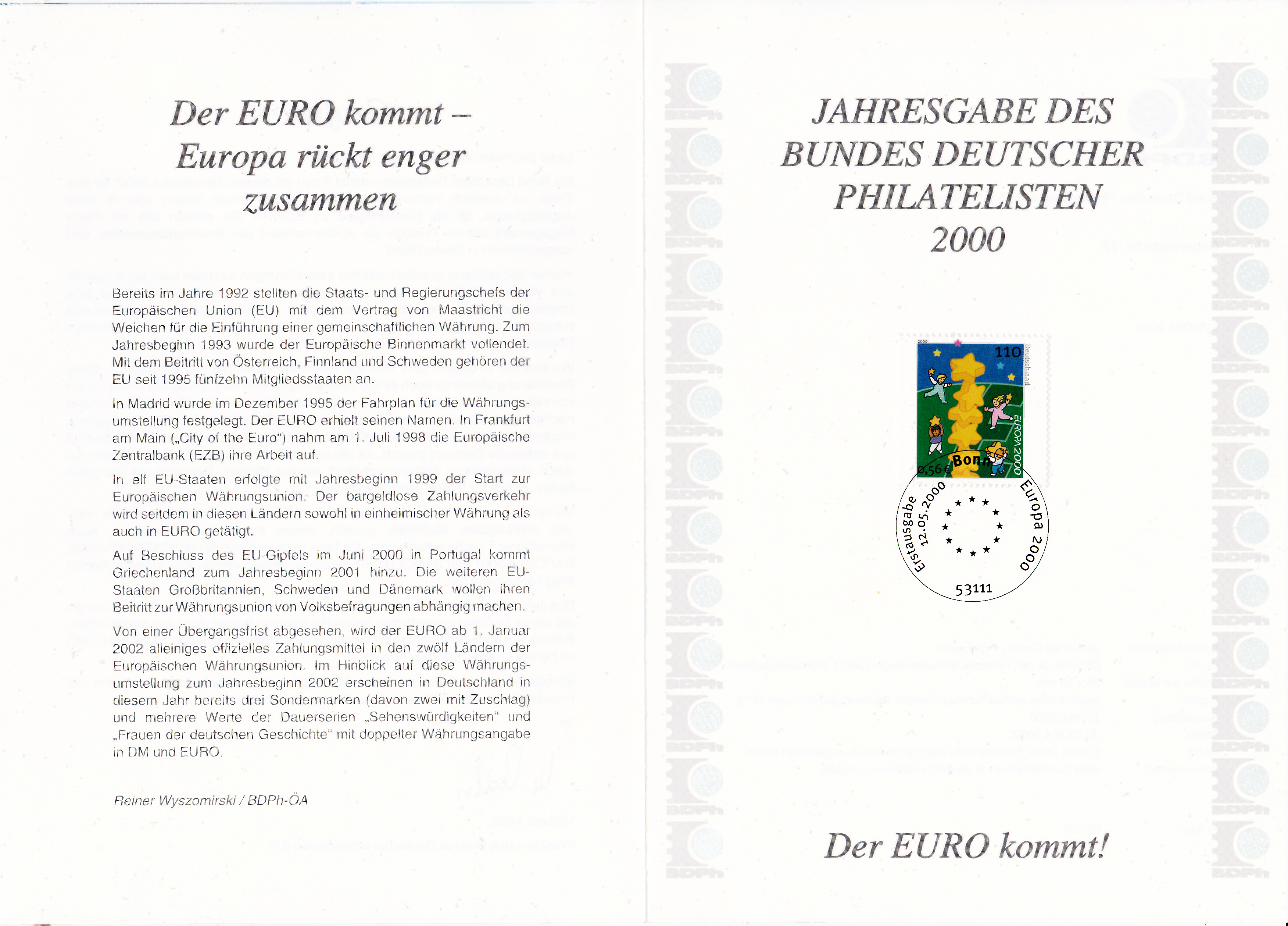 Klappkarte des Vorstandsvorsitzenden der Deutschen Post AG mit der bereits hier gezeigten Europamarke der Deutschen Post AG und dem Ersttagstempel aus Bonn.
