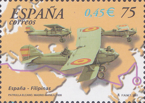 Zum Jubiläum "75 Jahre Flugwesen in Spanien" erschien diese Marke (MiNr 3624), die an einen Flug zu den Philippinen mit Doppeldeckern Breguet XIX im Jahre 1926 erinnert.