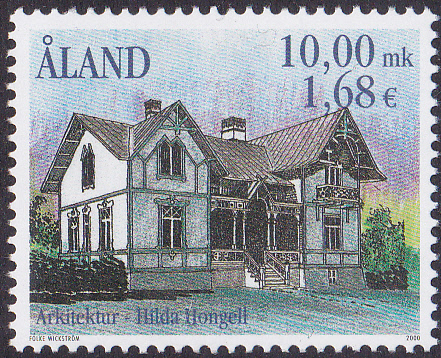 Auf dieser Marke der Ausgabe "Architektur der åländischen Badehausepoche" der Åland-Inseln (MiNr 179) wird ein Haus in Södragatan-Mariegatan von Hilda Hongell gezeigt.