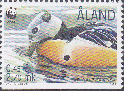Auf dieser Marke der Åland-Inseln (MiNr 183) ist ein Scheckentenpaar (Polysticta stelleri) im Flug zu sehen.