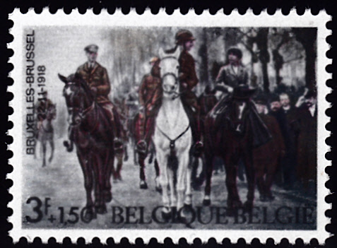 Hier eine Marke (MiNr 1531) dieser Serie. Sie zeigt ein Bild vom Einzug des Königspaares in Brügge am 19.10.1918.