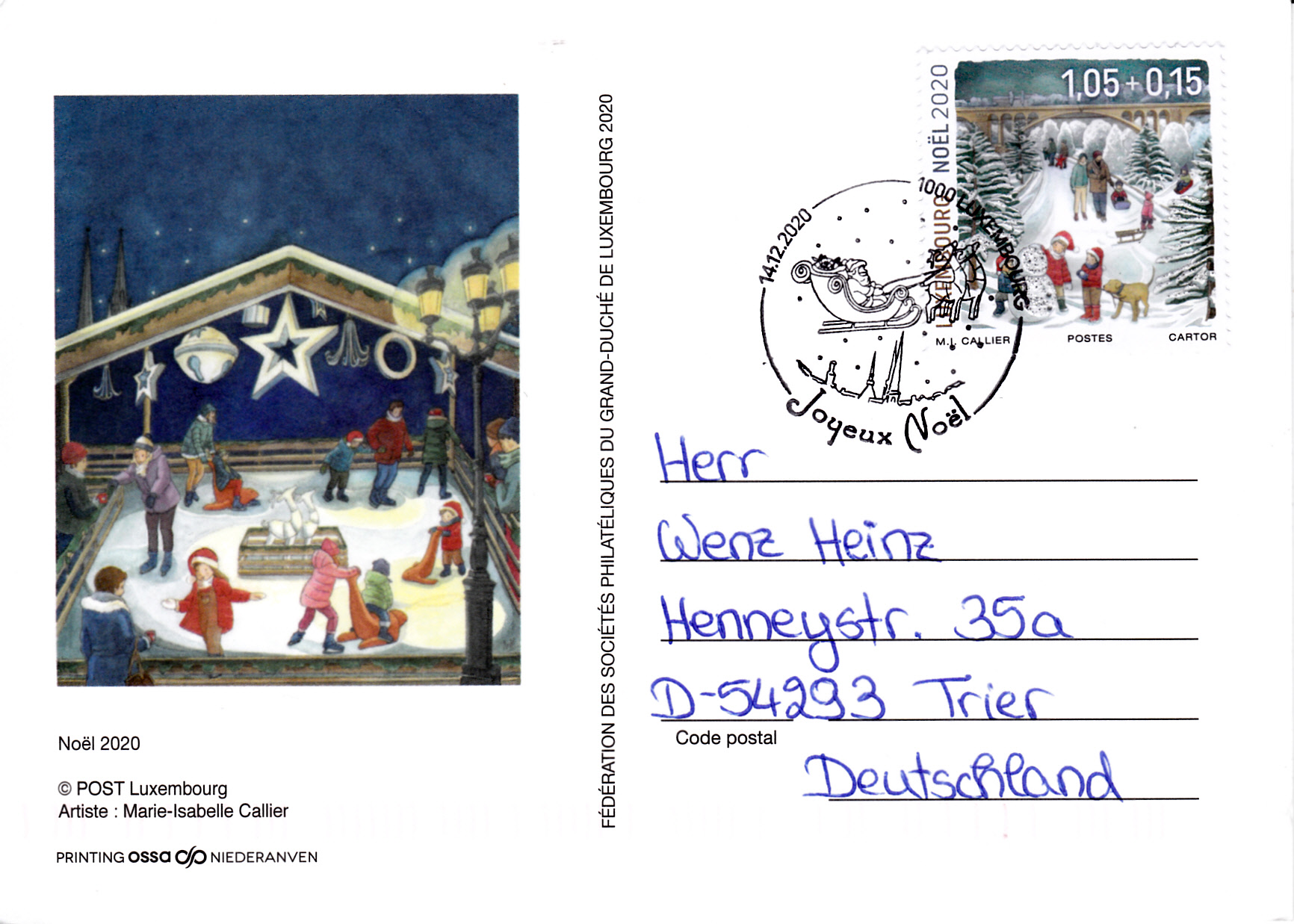 Postkarte von Luxemburg nach Trier mit dem Sonderstempel vom 14.12.2020 mit dem Weihnachtsgruß "Joxeux Noel". Zur Frankatur wurde eine Weihnachtsmarke 2020 zu 1,05+0,15€ verwendet.