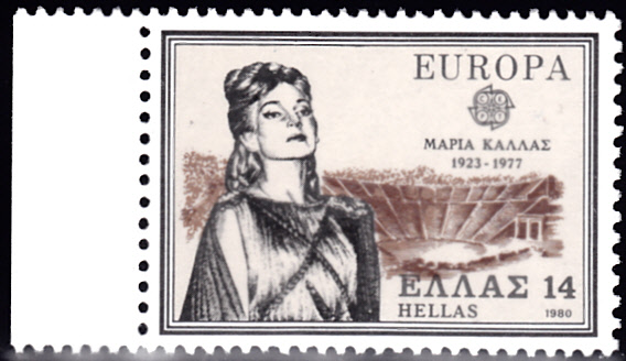 Die Europamarke 1980 zu 14 Drachmen aus Griechenland (MiNr 1412) zeigt ebenfalls ein Porträt von Maria Callas.