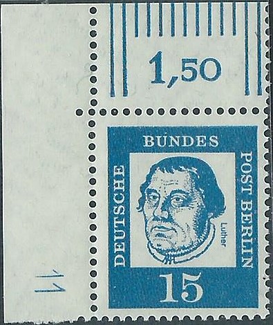 Die Wertstufe 15 Pf mit DZ 4 aus der rechten oberen Bogenecke: