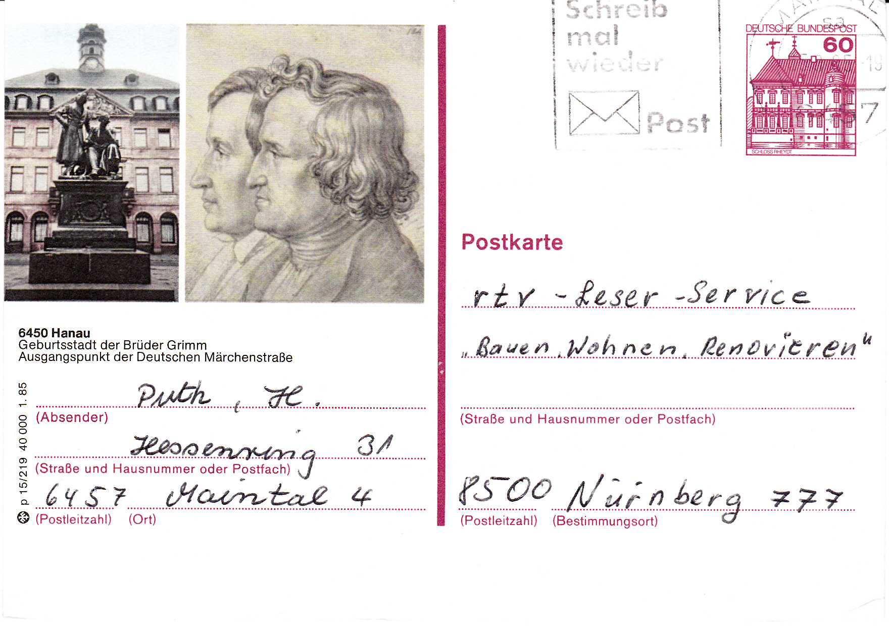Diese Bildpostkarte MICHEL P 138 aus der Teilserie = Auflage "p" (1985) zeigt die Gebrüder Grimm und macht Werbung für deren Geburtsstadt Hanau.