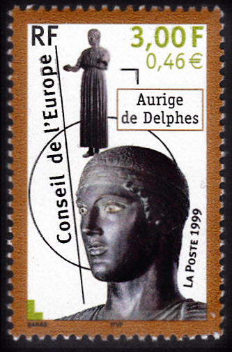 Hier zeige ich ein postfrisches Exemplar der Dienstmarke Europarat MiNr. 55 der Wertstufe zu 3.00 Fr / 0.46 € der Ausgabe "Antike und zeitgenössische Skulpturen" Sie zeigt eine Nachbildung der griechischen Bronzestatue "Auriga von Delphi" (um 475 v. Chr.).