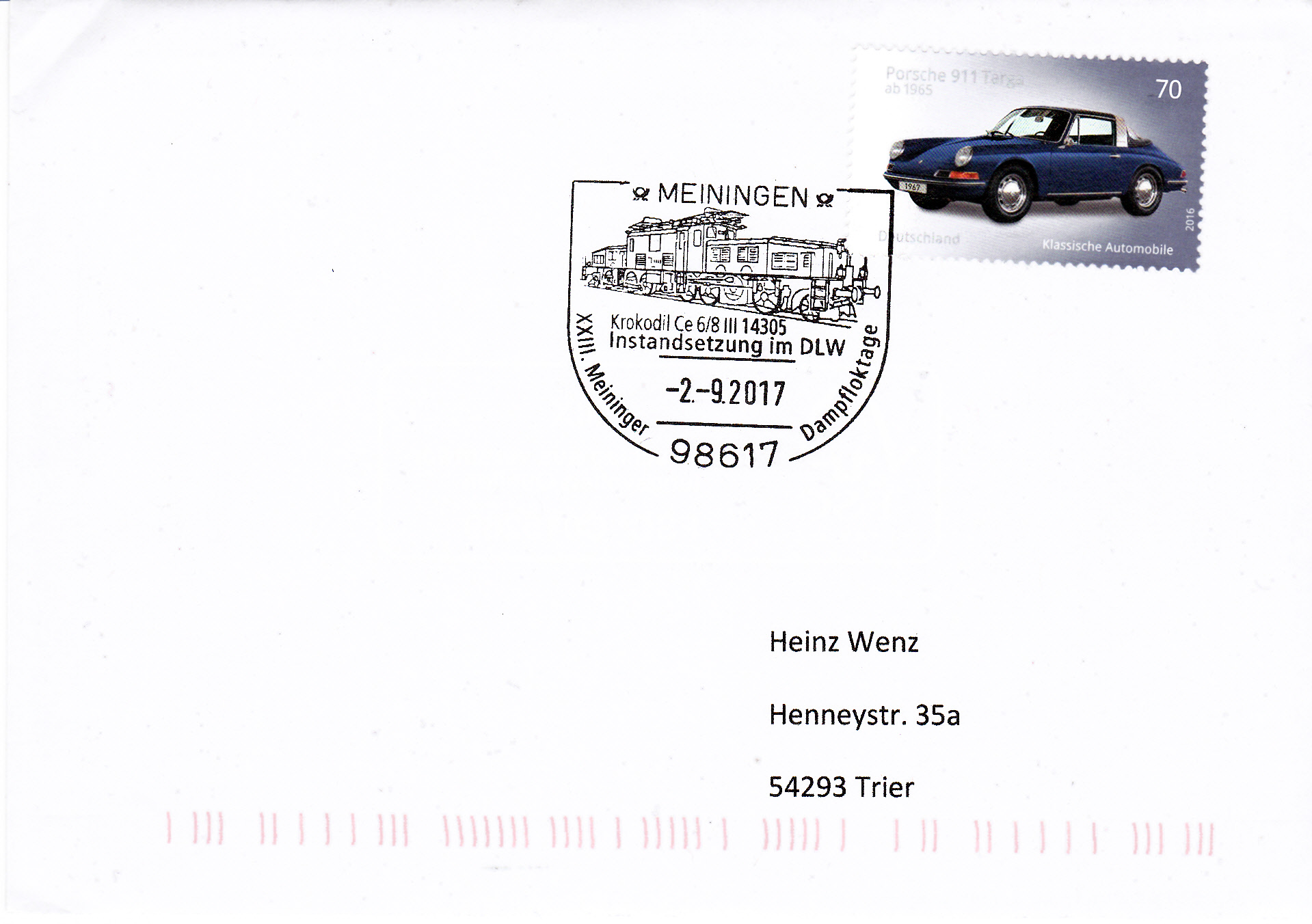 Dieser Sonderstempel aus Meininghen zeigt im Stempelbild ein Krokodil der Baureihe SBB Ce 6/8III der Schweizer Bundesbahn das von der Maschinenfabrik Oerlikon (MFO) und der Schweizerische Lokomotiv- und Maschinenfabrik (SLM) für den schweren Güterzugeinsatz auf der steilen Gotthardbahn entwickelt wurde.
