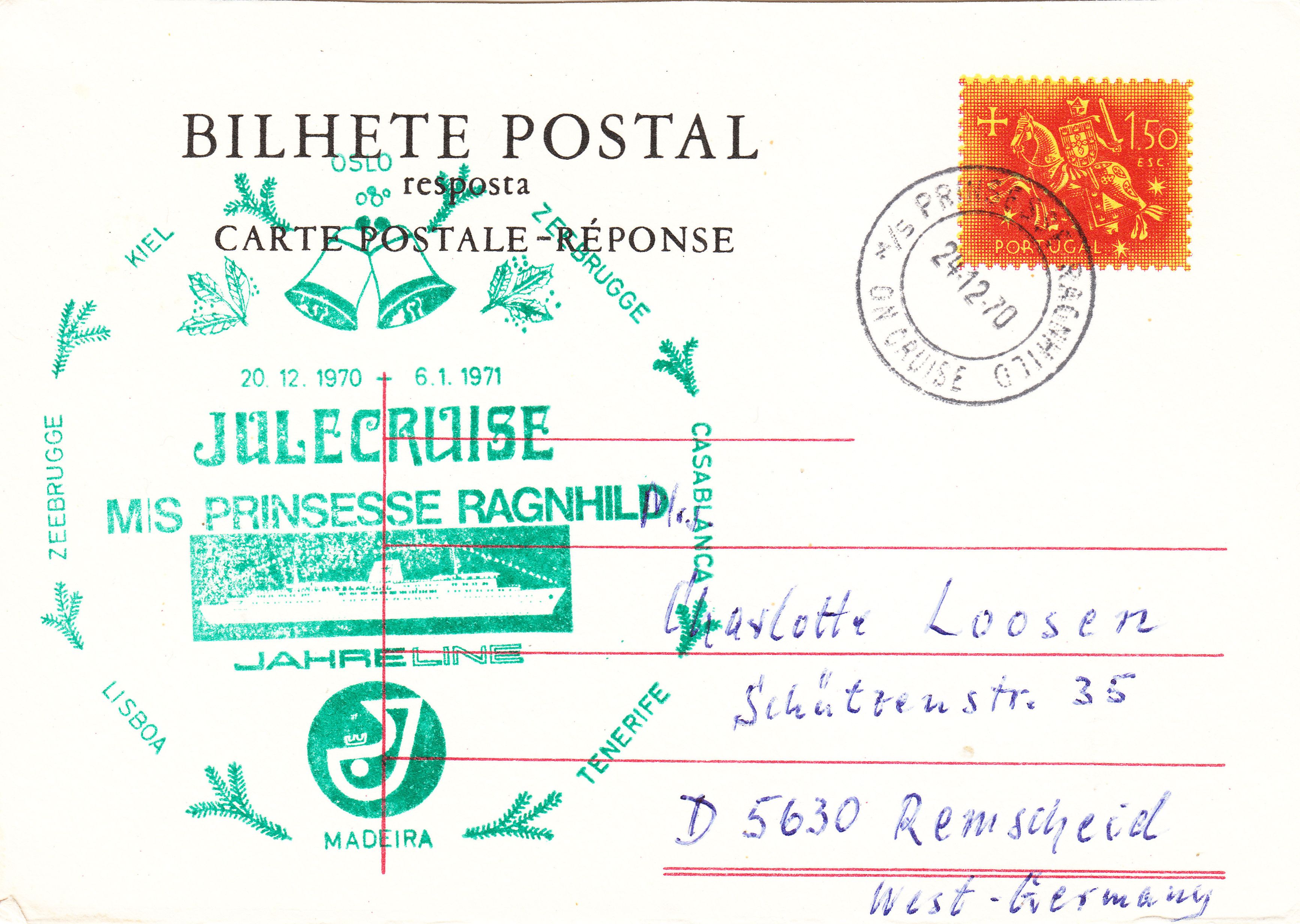 Zu Weihnachten 1970 führte die MS PRINSESSE RAGNHILD eine "JULECRUISE" = Weihnachtskreuzfahrt durch, was der Cachetstempel auf diesem Beleg dokumentiert. Die portugiesische Ganzsache wurde am 24.12.1970 = Heiligabend an Bord des Schiffes aufgegeben und per Bordstempel entwertet: