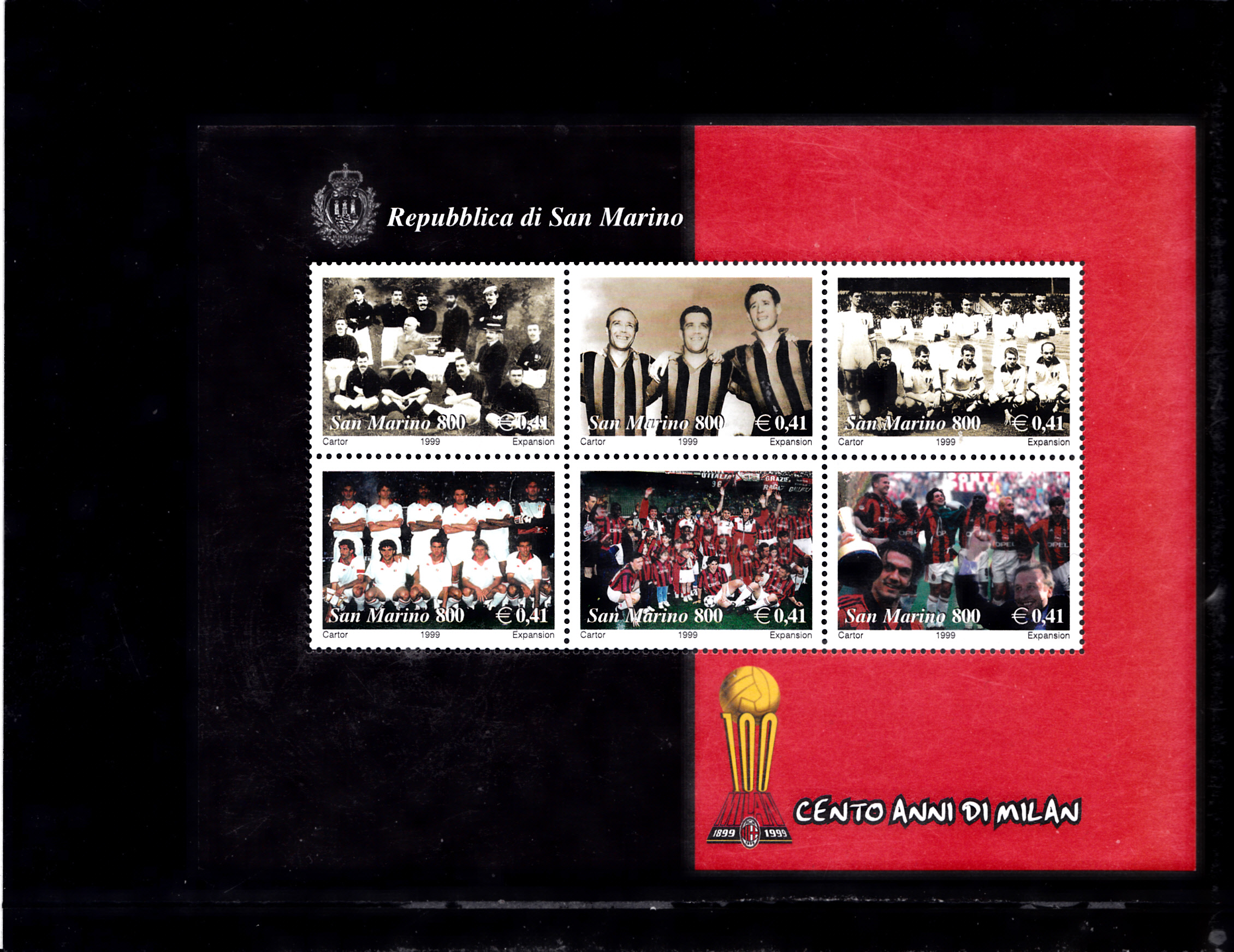 Zum Jubiläum "100 Jahre Fußballklub AC Mailand" ist in einer Ausgabe in San Marino diese Marke (MiNr 1856) mit dem Bild der Meistermannschaft des AC Mailand aus dem Jahre 1901, die bereist 17 Monate nach der Vereinsgründung erreicht wurde.
