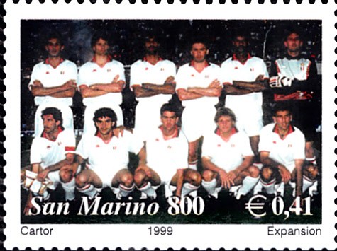 Zum Jubiläum "100 Jahre Fußballklub AC Mailand" ist in einer Ausgabe in San Marino diese Marke (MiNr 1856) mit dem Bild der Meistermannschaft des AC Mailand aus dem Jahre 1901, die bereist 17 Monate nach der Vereinsgründung erreicht wurde.