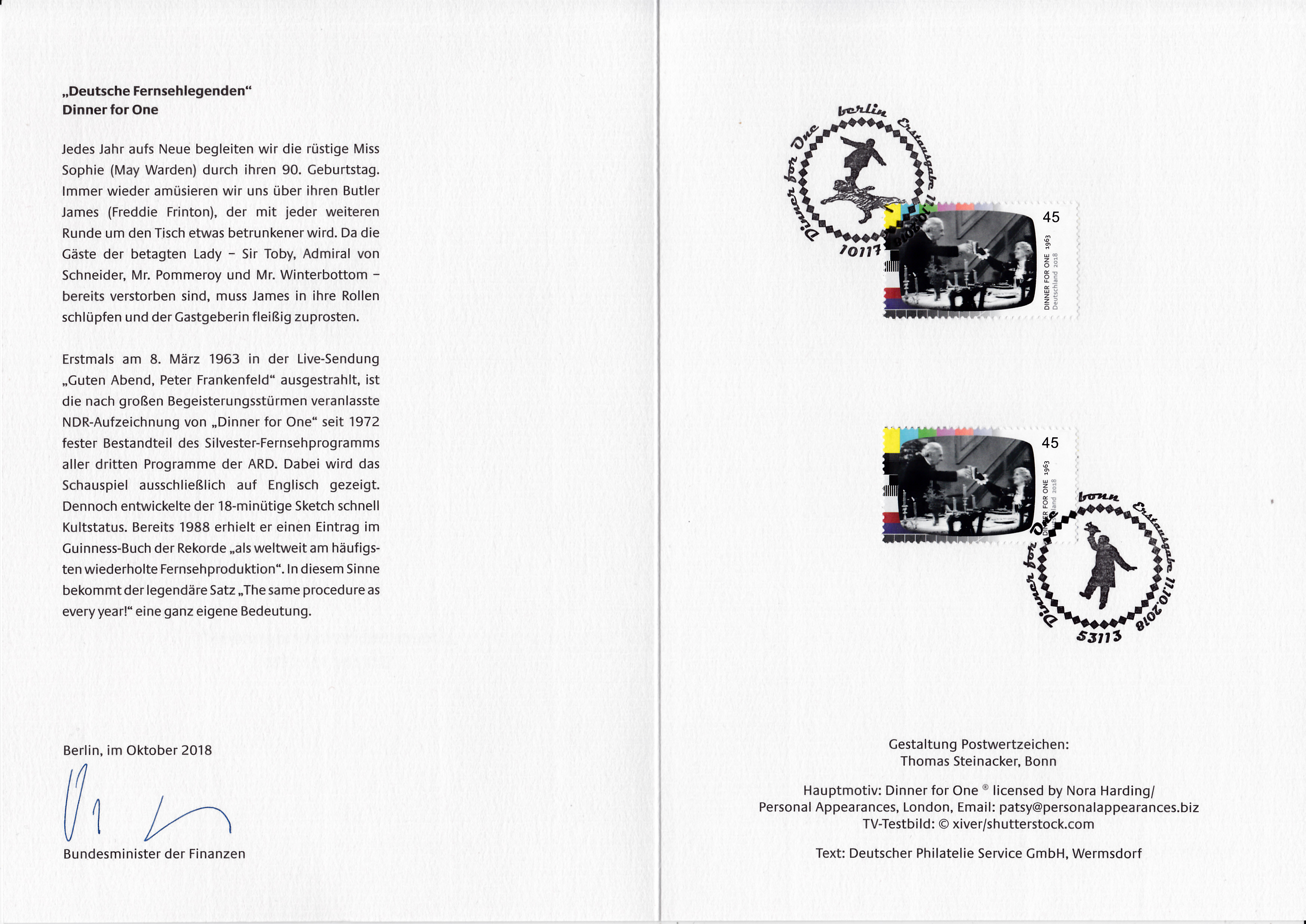 Ministerkarte des Finanzministers mit zwei Marken (MiNr 3415) aus der Serie "Deutsche Fernsehlegenden" mit dem Motiv "Dinner for One" und mit den beiden Ersttagsonderstempel Bonn und Berlin.