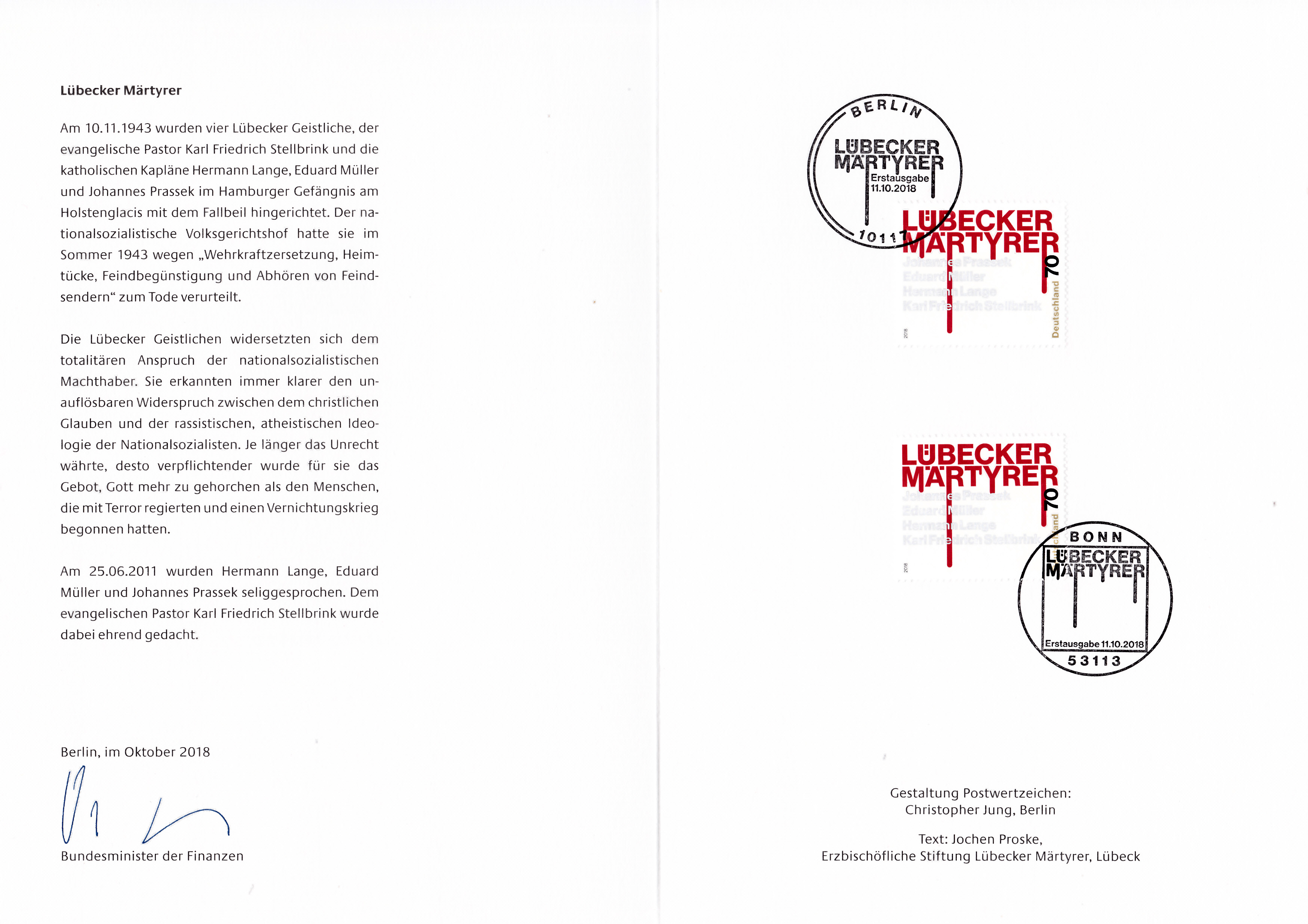 Ministerkarte des Finanzministers mit zwei Marken "Lübecker Märtyrer" (MiNr 3417) und mit den beiden Ersttagsonderstempel Bonn und Berlin.