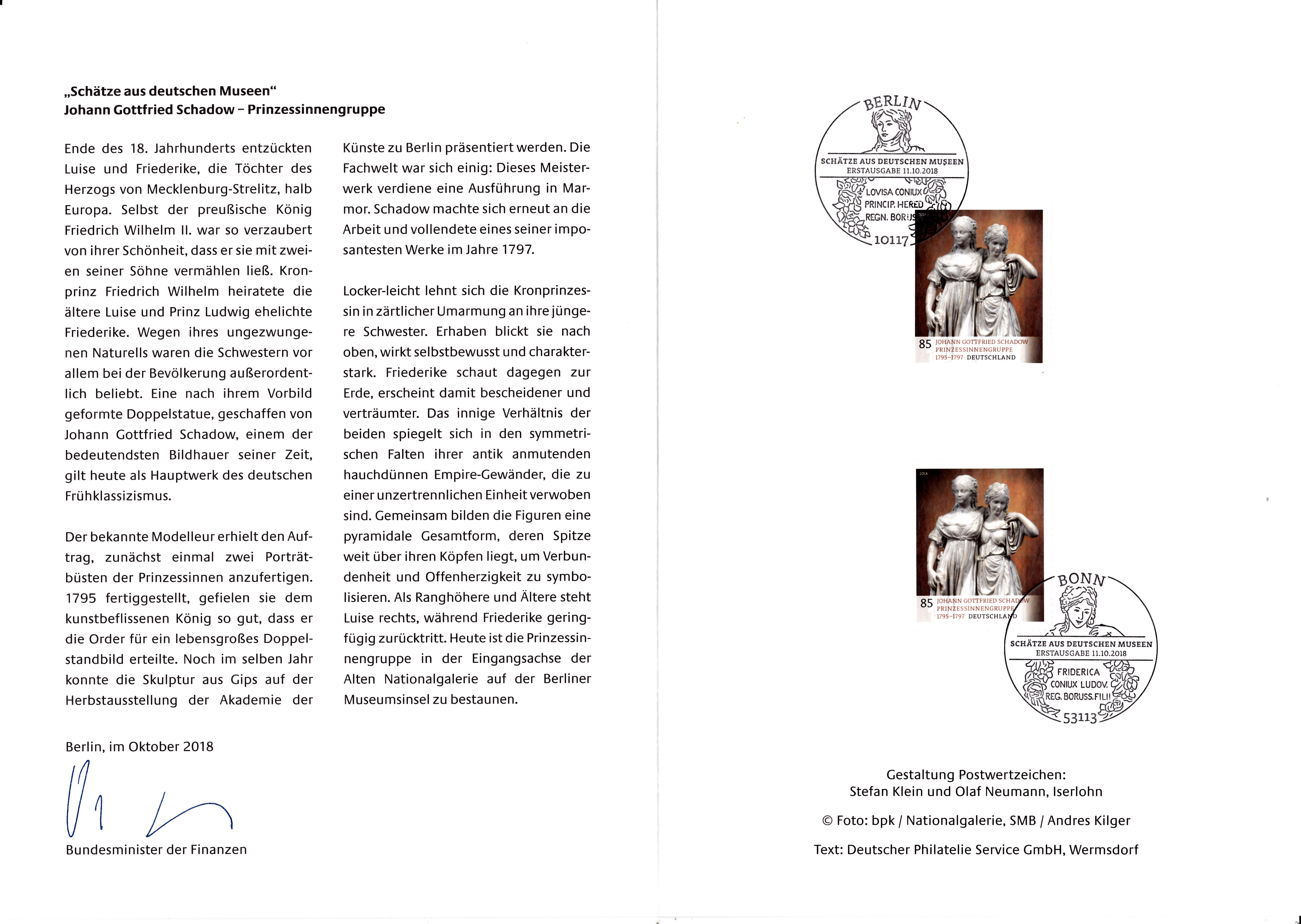 Ministerkarte des Finanzministers mit zwei Marken (MiNr 3416) aus der Serie "Schätze aus deutschen Museen" mit dem Doppelstandbild "Prinzessinnengruppe" von Johann Gottfried Schadow (1764-1850) und mit den beiden Ersttagsonderstempel Bonn und Berlin.