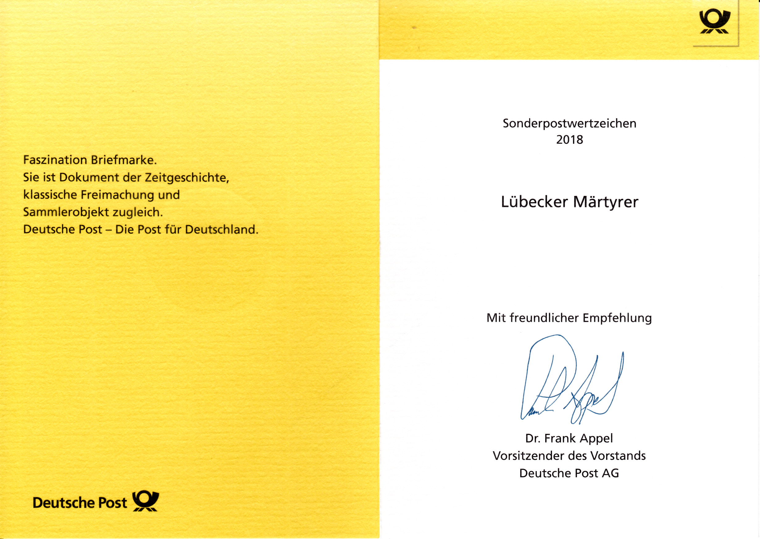 Klappkarte des Vorstandsvorsitzenden der Deutschen Post AG mit der Marke "Lübecker Märtyrer" (MiNr 3417) und mit dem Ersttagsonderstempel Bonn.