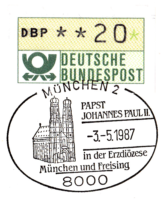 Sonderstempel aus München vom 3.5.1987 zum Besuch des Papstes Johannes Paul II in der Diözese München und Freising. Als Motiv des Stempels wurde die Frauenkirche München eingesetzt.