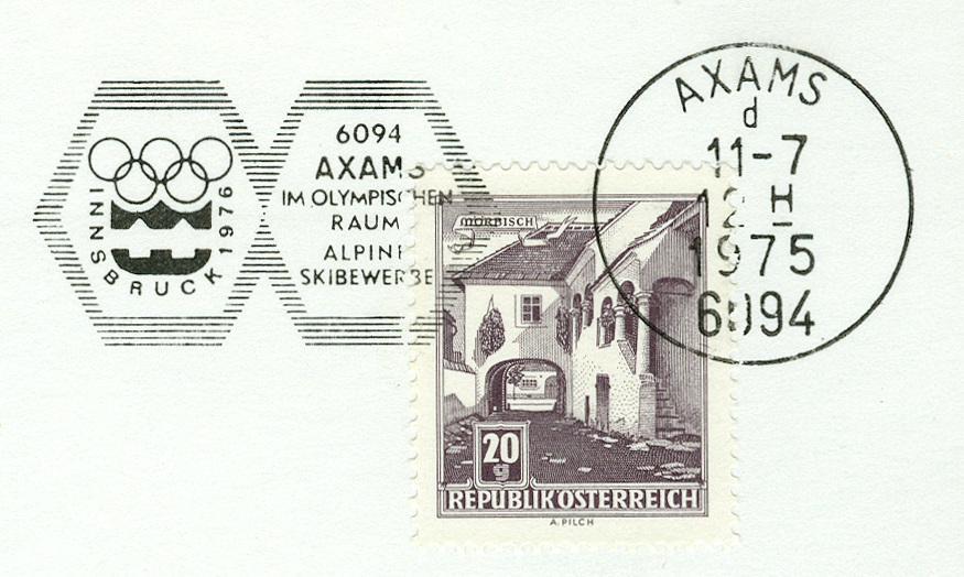 Hier die Marke mit der österreichischen Rennrodlerin in der Disziplin "Einsitzer, Damen" auf einem Ersttagsbrief mit Ovalstempel des Austragungsortes 6094 Axams mit der Kennziffer "6":