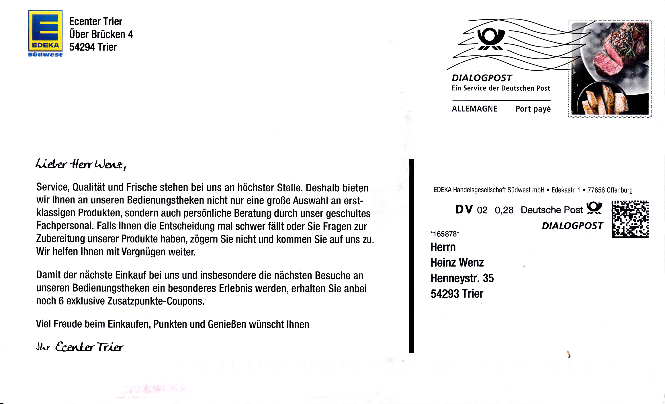 Dieser Faltbrief mit Dialogpost des Edeka-Center Trier hat einen Wertstempelähnlichen Zudruck mit einem Rinderfilet.