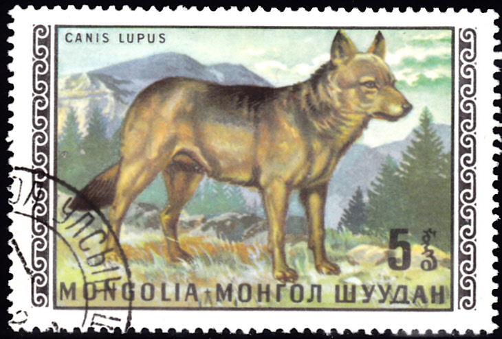 Diese Marke aus einer Serie "Einheimische Tierwelt" aus der Mongolei (MiNr 578) belegt, dass der Wolf (Canis lupus) aus in Asien heimisch ist.