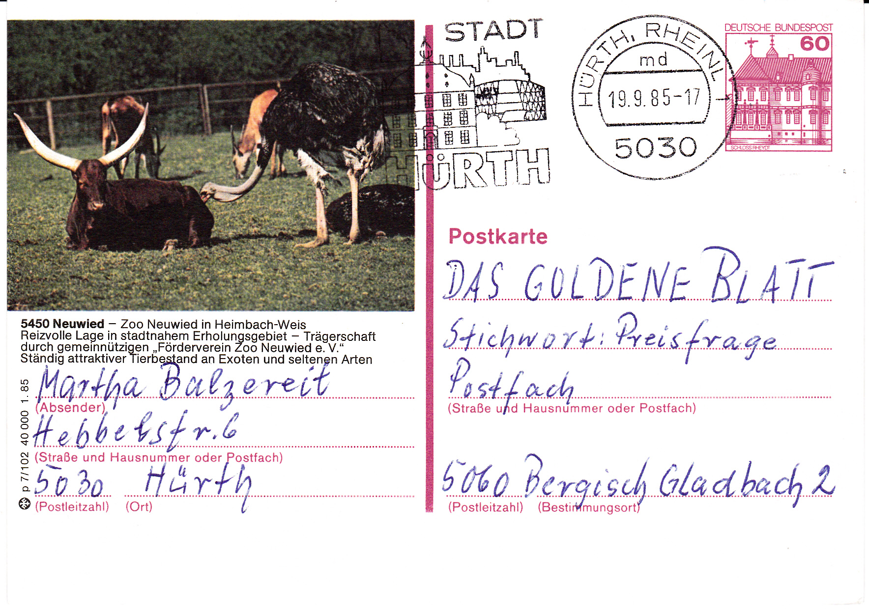 Bildpostkarte MICHEL P 138 aus der Teilserie = Auflage "p" (1985) mit Bild aus dem Zoo Neuwied.