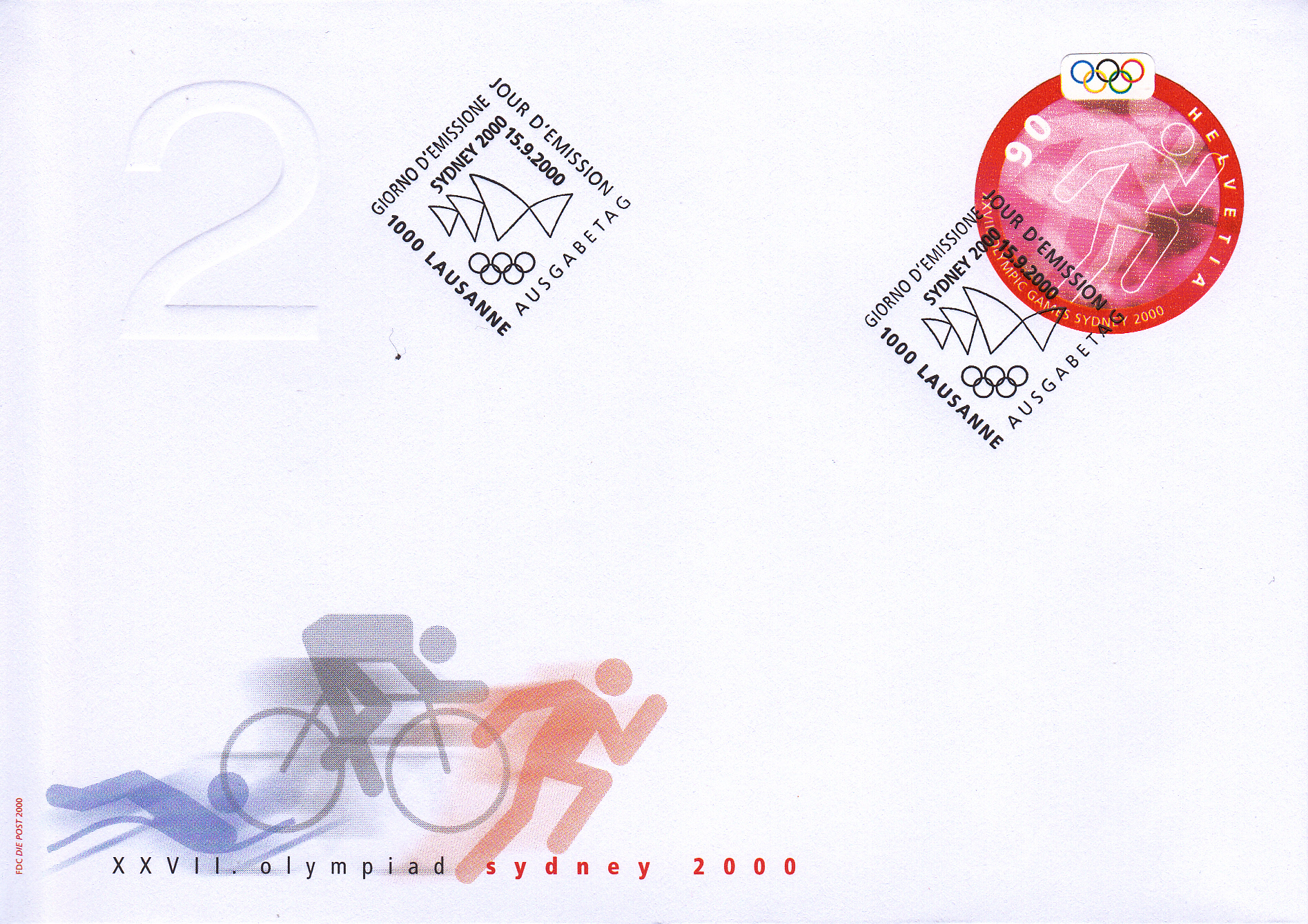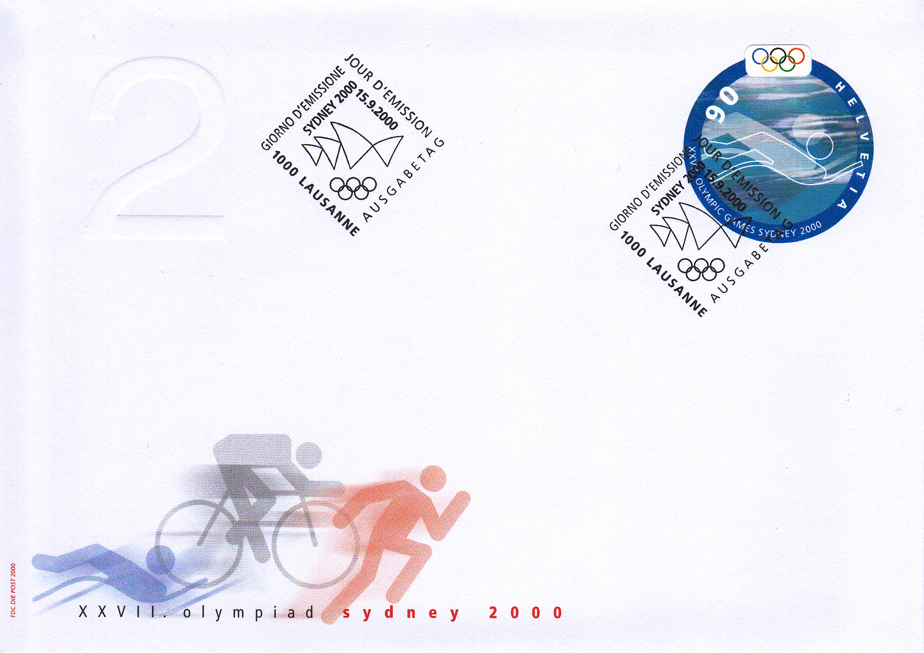 Diese selbstklebende Marke aus der Schweiz (MiNr 1735) zu den Sommerspielen 2000 zeigt einen stilisierten Schwimmer.
