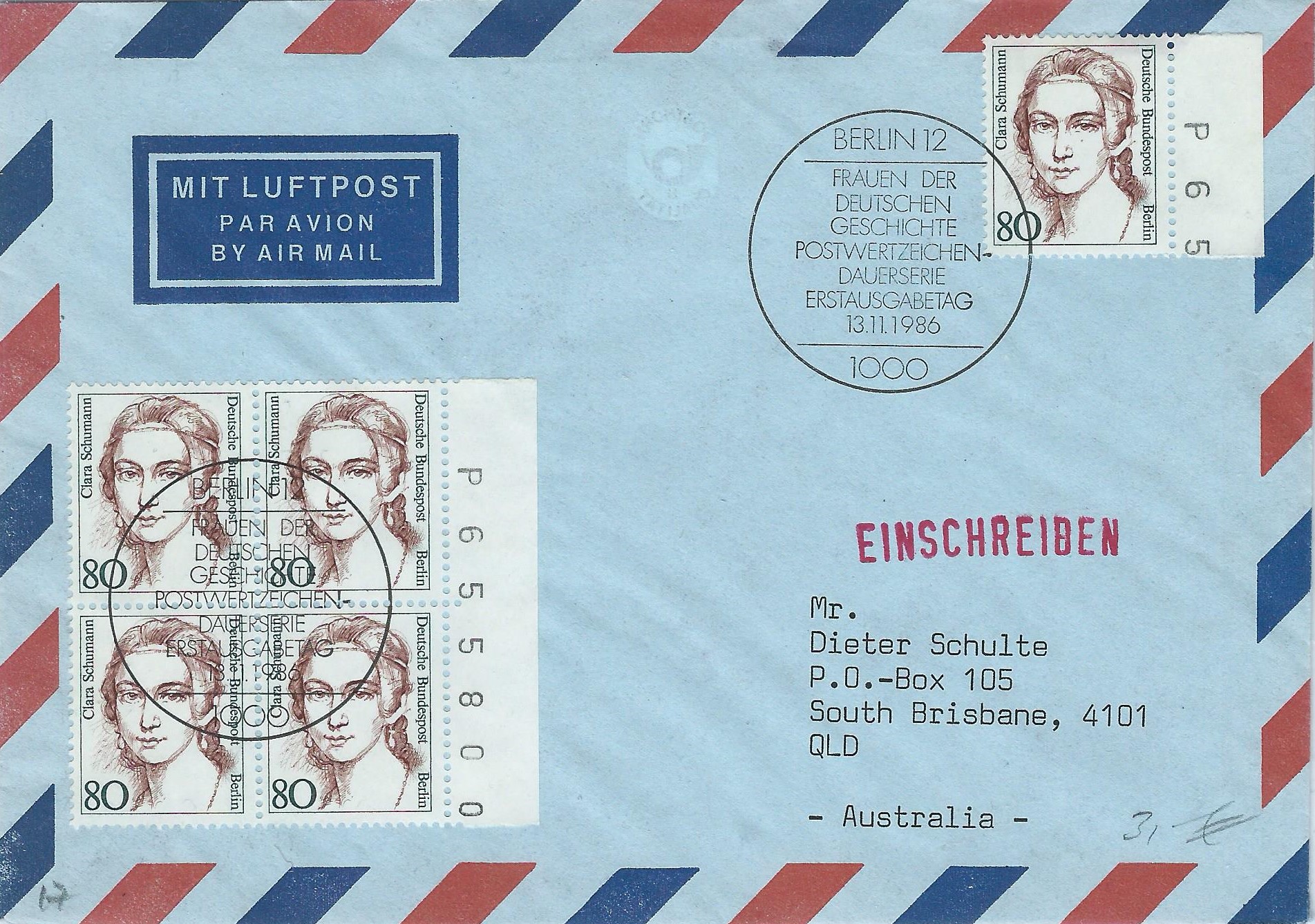 hier ein Beleg, der es mir sofort angetan hat: Verklebt wurde neben einer einzelnen Marke zu 80 Pf noch ein 4-er-Block vom rechten Bogenrand. Auf dem Bogenrand ist auch noch die Bogenzählnummer komplett erhalten. Solche Einheiten sieht man lose schon kaum einmal, hier klebt sie sogar auf einem Ersttagsbrief. In diesem Falle ist mir auch egal, ob hier eine richtige Portostufe vorliegt, mir geht es vorrangig um die Einheit mit der Bogenzählnummer. Gestempelt wurde mit dem passenden Ersttagssonderstempel Berlin am 13.11.86.