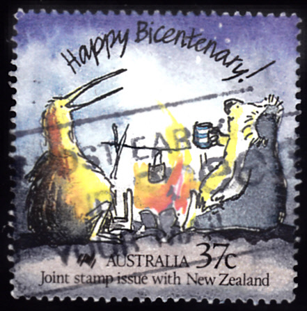 Diese Marke aus Australien (MiNr 1118) zum Jubiläum "200 Jahre Kolonisation von Australien" zeigt eine Zeichnung mit einem neuseeländischen Kiwi und einem australischen Koalabär am Lagerfeuer.