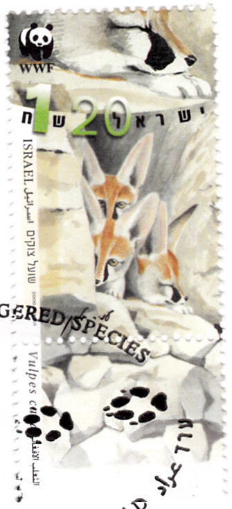 In einer Serie "Weltweiter Naturschutz" aus Israel ist diese Marke (MiNr 1555) mit einem Afghanfuchs (Vulpes cana) auf einem Felden erschienen.