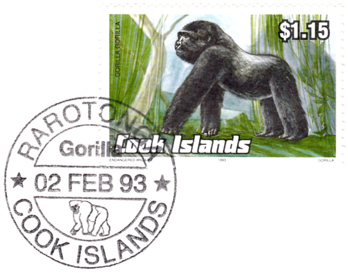 Auf einer Marke aus der gleichen Serie der Cook-Inseln (MiNr 1386) ist ein Gorilla (Gorilla gorilla) abgebildet. Hier eine Marke mit dem zur Marke passenden Ersttagstempel.