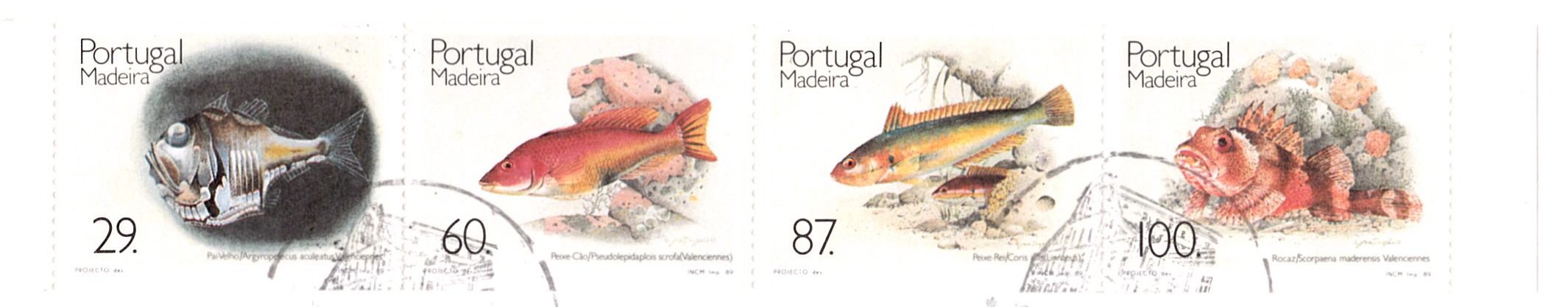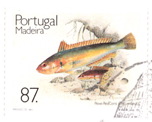 Auf einer weiteren Marke (MiNr 132) der gleichen Serie ist ein Madeira-Drachenkopf (Scorpaena maderensis) zu sehen.