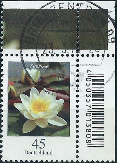 Dann der 45 Cent-Wert Seerose aus der rechten oberen Bogenecke mit Stempel Briefzentrum 09 vom 23.3.18: