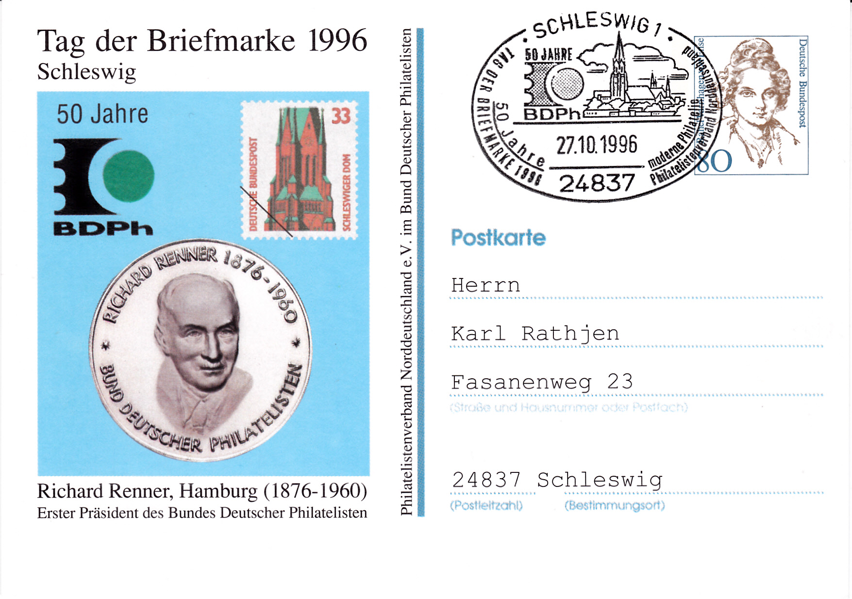 Ganzsache des LV Philatelistenverband Norddeutschland e.V. mit dem dazu passenden Sonderstempel vom 27.10.1996 aus Schleswig zum Tag der Briefmarke 1996.