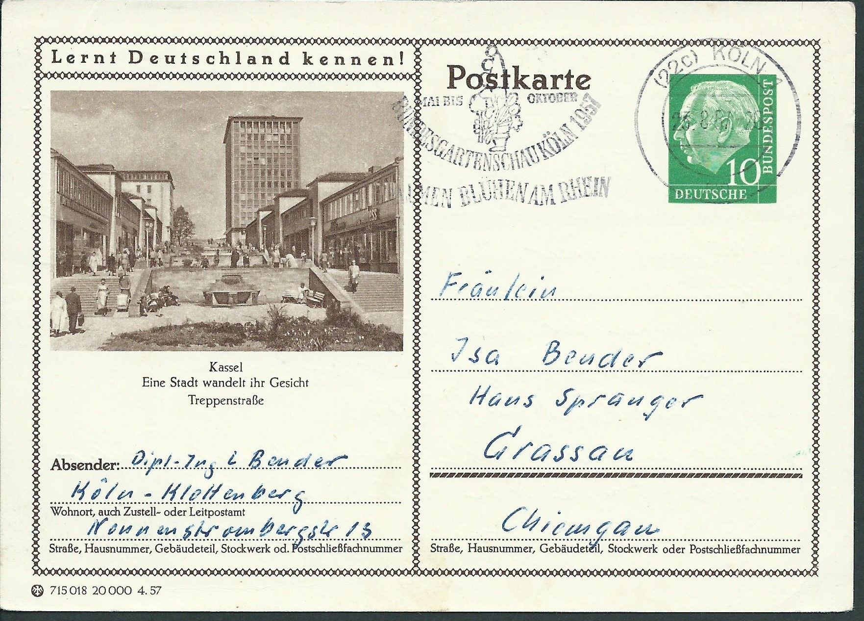 kürzlich konnte ich auf einer Börse für kleinstes Geld 3 Bildpostkarten mit Heuss-Wertstempeln erwerben: Sie haben alle einen Bildzudruck mit dem Obertitel "Lernt Deutschland kennen". Den Anfang macht hier die Karte mit einem Wertstempel Heuss I 10 Pf mit der Städtewerbung für Kassel: