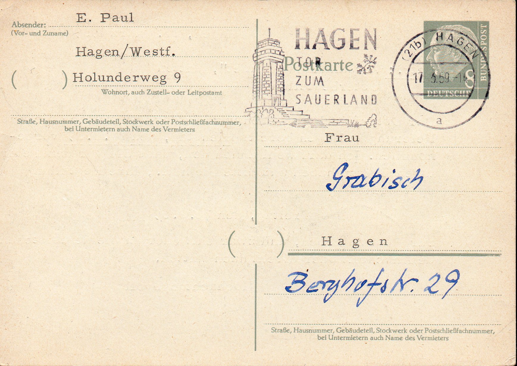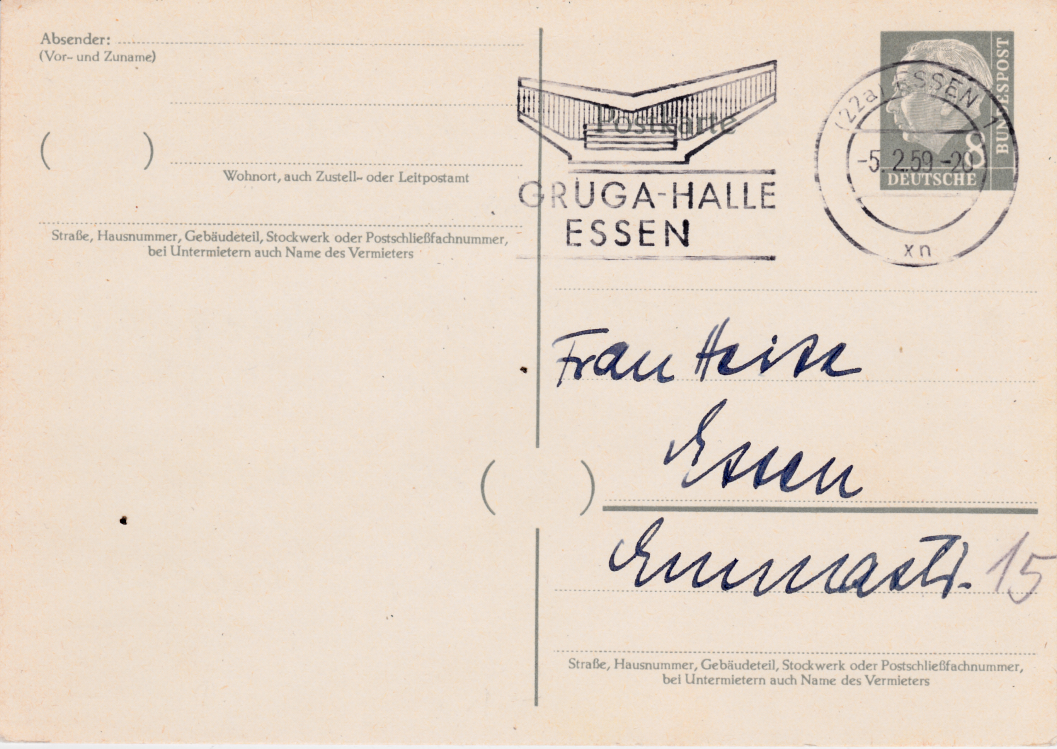 hier ist mir eine schöne Postkarte in die Hände gefallen: Aus der Serie „Lernt Deutschland kennen“ mit einem Wertstempel Heuss III 10 Pf und dem Bildmotiv „Messegelände Hannover“, gestempelt mit dem Messe-Sonderstempel Hannover vom 24.4.60. Ich finde, diese Sorte Karten hat das gewisse „etwas“ und die nehme ich gerne mit in die Sammlung auf.