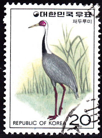 Auf dieser Marke aus Süd-Korea (MiNr 1025) ist ein Weißnackenkranich (Grus vipio) abgebildet.