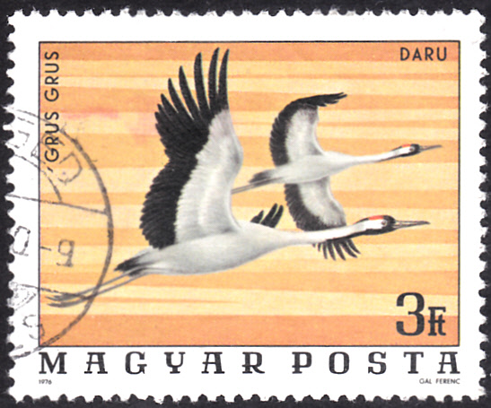 In der Serie "Vögel aus dem Nationalpark Hortobágy" erschien 1977 in Ungarn auch eine Marke (MiNr 3175 A) mit zwei fliegenden Kranichen (Grus grus).