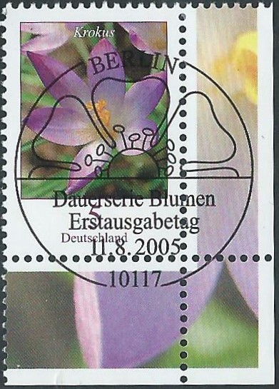 Den Anfang macht der Wert zu 5 ct aus der rechten unteren Bogenecke mit Ersttagssonderstempel Berlin vom 11.8.2005:
