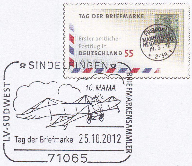 Dieser Sonderstempel vom 25.10.2012 aus Sindelfingen zum Tag der Briefmarke 2012 des LV Südwest wurde auf einer Sonderganzsache zur 30. Int. Briefmarken Börse Sindelfingen mit dem Wertstempel "Tag der Briefmarke 2012" abgeschlagen.