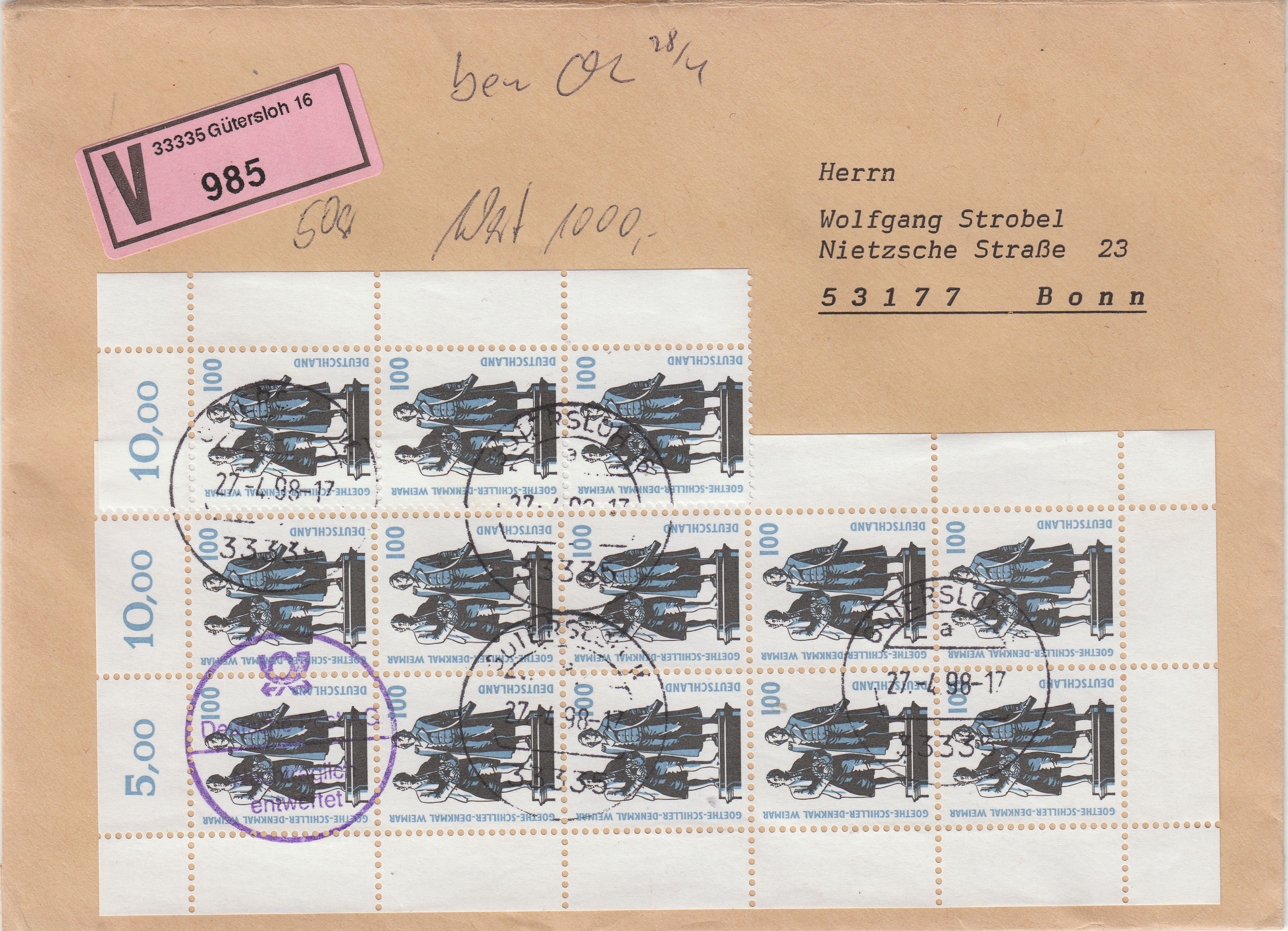 Die auf dem Beleg unten links verklebte Marke hatte keine Entwertung per Tagesstempel "abbekommen" und wurde daher von der Deutschen Post "nachträglich entwertet".